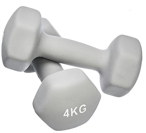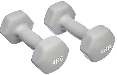 Each dumbbell weighs 4 kilograms, which gives you just the right amount of heft for a decent workout. Made from cast iron with a neoprene coating, they offer durability that stands the test of time and a non-slip texture that's all about grip security, no matter how sweaty things get. And let's talk about that hexagonal shape – it's not just for looks. It keeps your gear from rolling away mid-session, saving you the hassle of constantly chasing after them.
