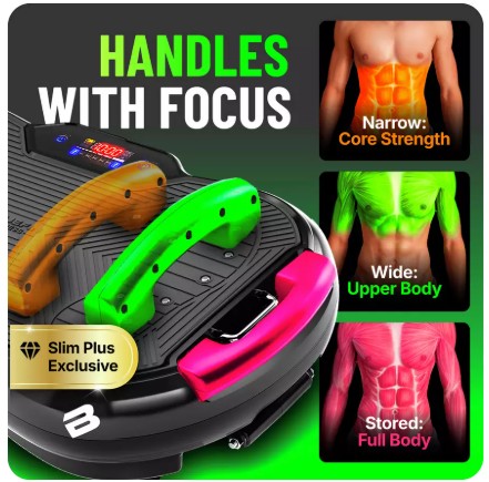 The machine also includes detachable handle mounts and resistance bands, which allow for simple upper body exercises while standing on the plate. I think this is a practical addition, especially for people who want a quick full body routine rather than using the machine purely for standing vibration sessions.