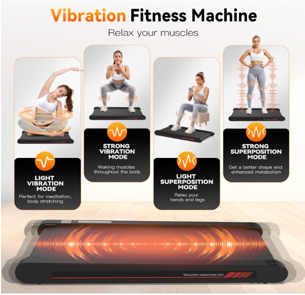 Control options include both a handheld remote and app connectivity, allowing users to adjust speed and vibration settings. The four vibration modes are designed to provide varying intensity levels, which may help with muscle relaxation after walking.