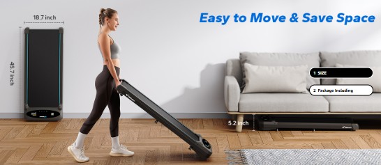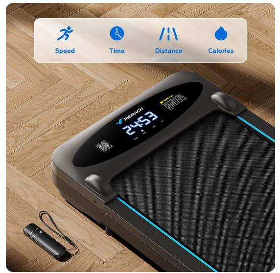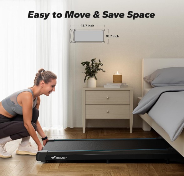 With a height of just 13 cm, the Merach Walking Pad fits under desks, beds, and sofas. Built-in wheels and portable armrests allow easy movement and storage in both upright and horizontal positions.
