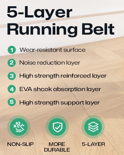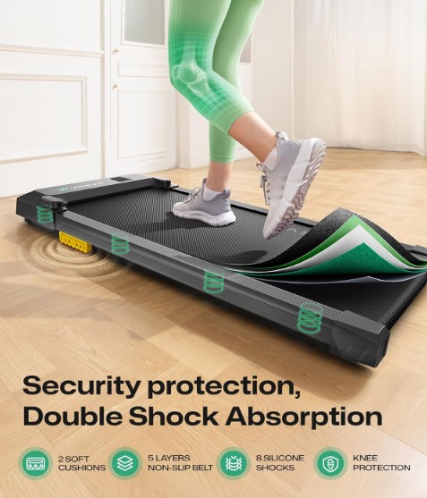 UREVO highlights its 5-layer belt, 8 silicone shock absorbers, and 2 rubber pads for joint protection. On paper, that sounds reassuring. The 90 cm by 38 cm belt is relatively standard for compact models, though taller users may find it slightly restrictive.