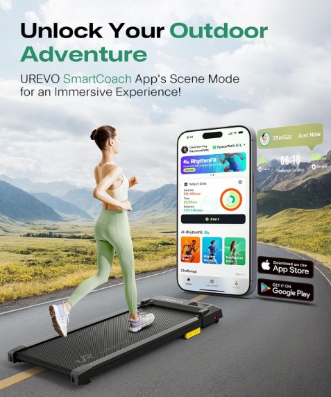 Compatibility with UREVO SmartCoach, Kinomap, and Zwift adds a slightly more modern feel than some basic walking pads. Real-time tracking and virtual routes may improve engagement for certain users.